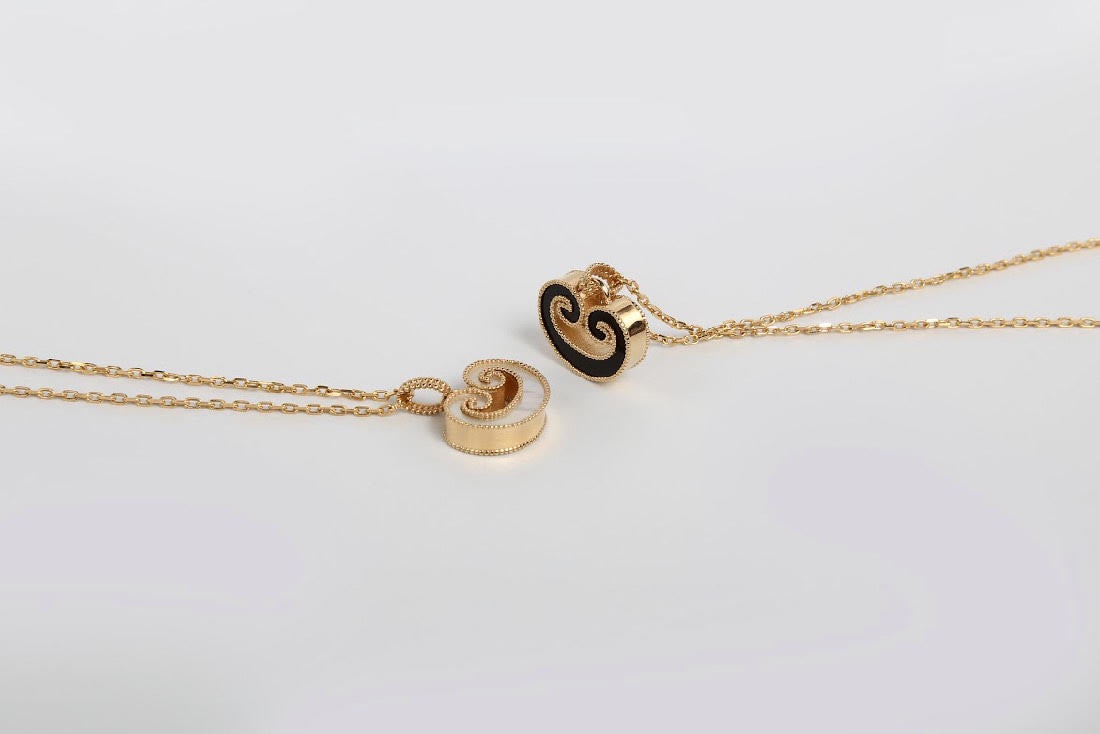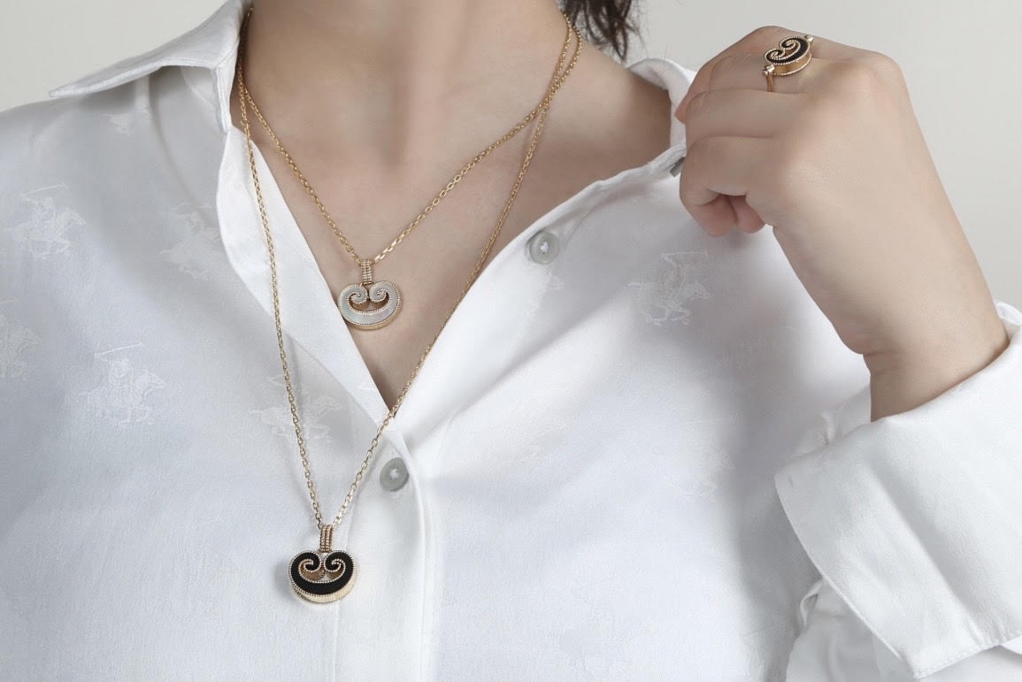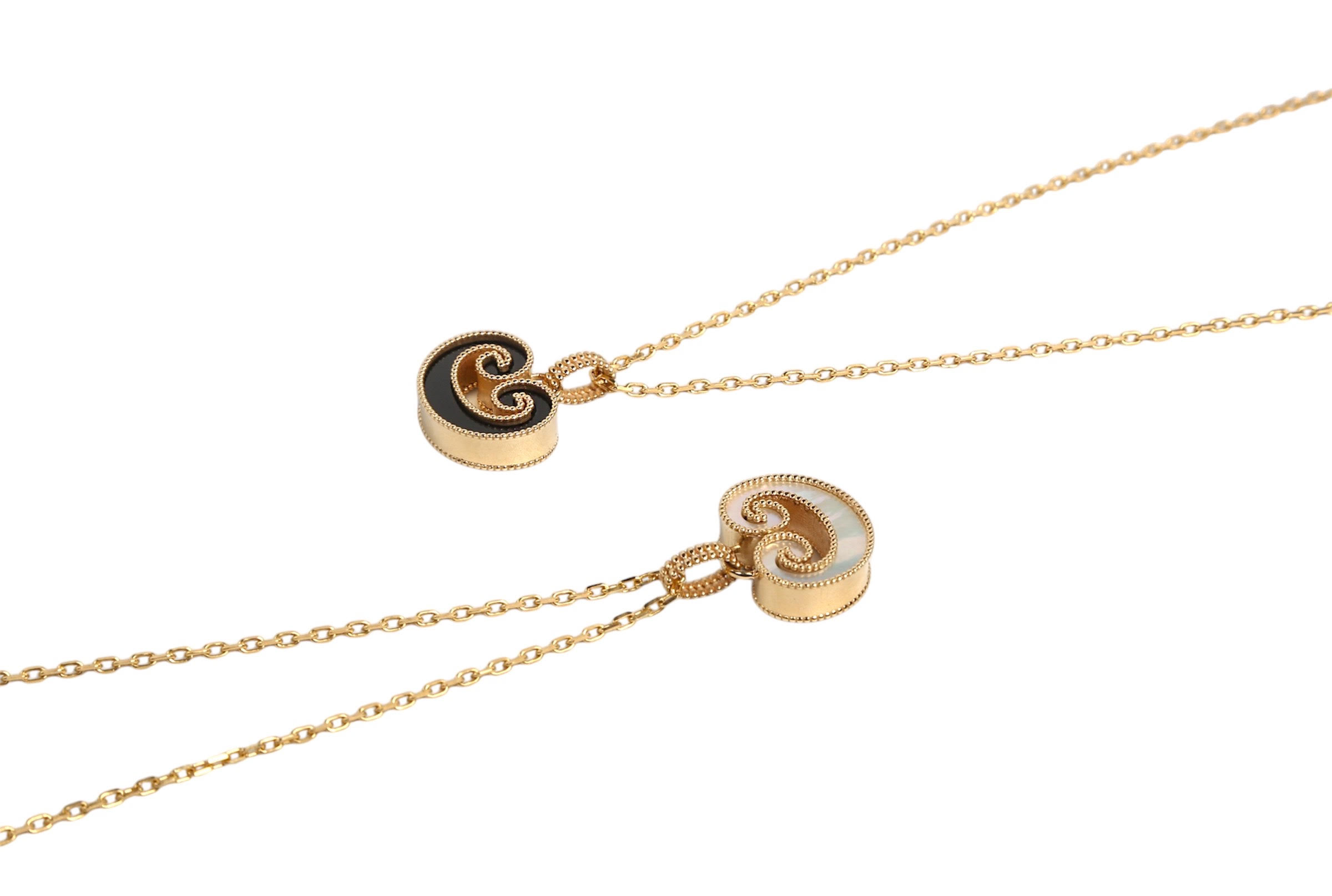 عقد من مجموعة الأكانتس ، يمثل تعبيرا عصريا عن الأناقة ، وقابل للانقلاب على وجهين مرصع بعرق اللؤلؤ والأونكس الأسود.