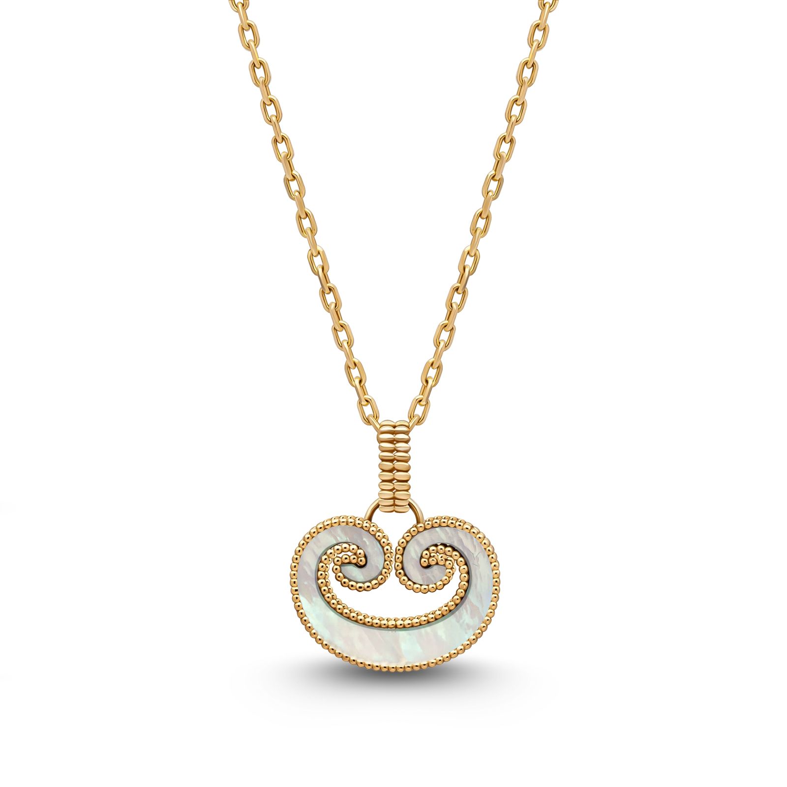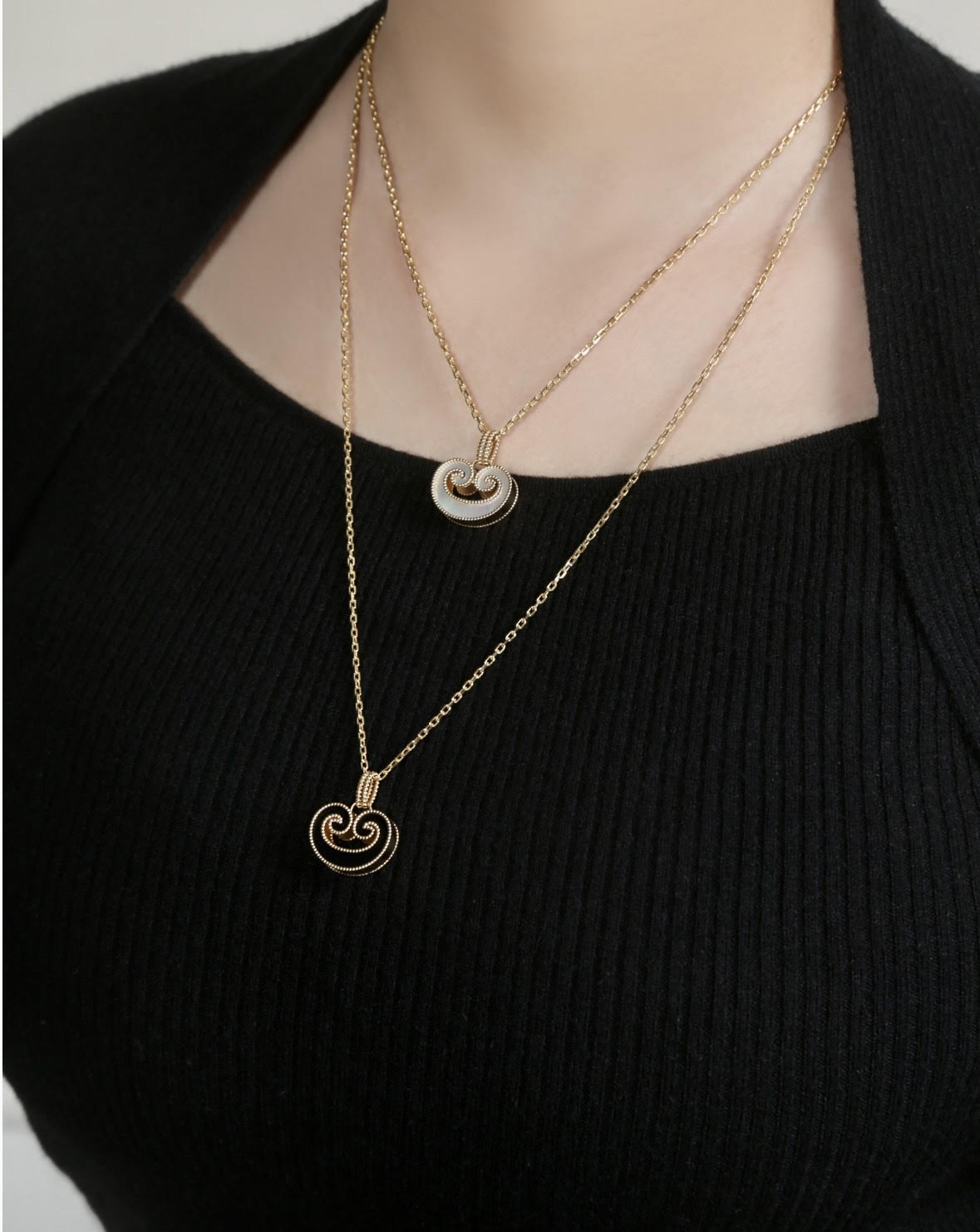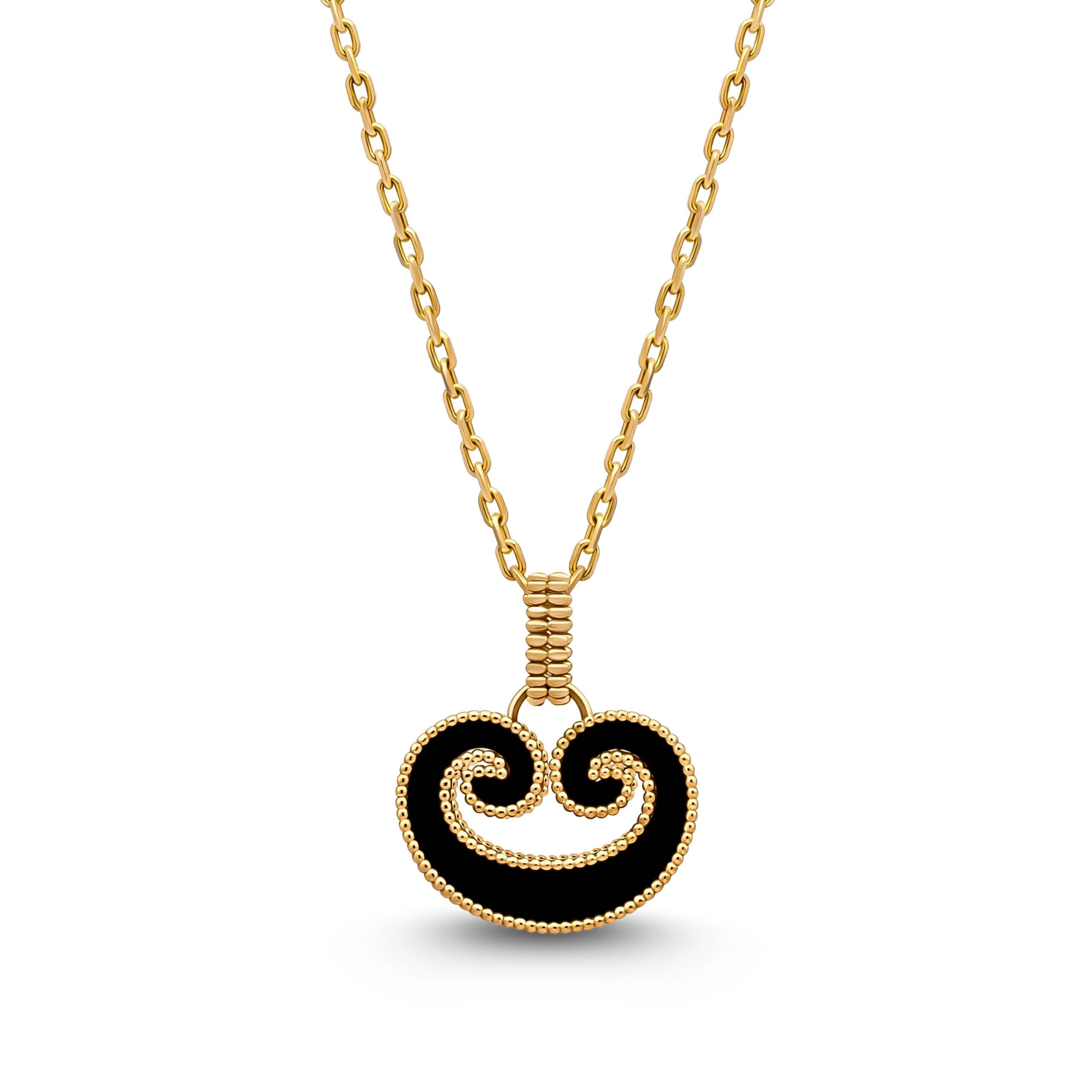 عقد من مجموعة الأكانتس ، يمثل تعبيرا عصريا عن الأناقة ، وقابل للانقلاب على وجهين مرصع بعرق اللؤلؤ والأونكس الأسود.